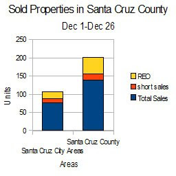 From the begining of Dec 2009 139 Condos, Townhomes, and Single family residences have sold in all of Santa Cruz County. Of those sales 17 were sold as short sales and 45 were sold as REO's. In the Santa Cruz City area which is a less distressed area than the rest of Santa Cruz County includes Capitola, Aptos, Rio Del Mar, Soquel, Santa Cruz, and Soctts Valley. These areas saw 78 sold properties 10 that were short sales and 18 that were REOs.