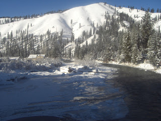 Further down the road, I cross the South Fork of the Payetter River. In the summer, kayakers and rafters flock to downstream sections of this river to test their skills on Class IV and Class V rapids. This particular section is not as popular, so the occassional brightly-colored kayak passing by in the summer is a welcome sight.