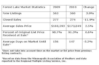 The sold signs went up faster on homes in the community of Forest Lake Minnesota in 2010 compared to 2009 as the days on the market before a sale yet again dropped this year. And now the average price is just a bit more than last year too! The average sales price of a home was down nearly 28% in 2009 so even a small increase in average price is a step in the right direction for this north Washington County/east Anoka County community. Closed sales are down almost 12% but sellers received a bit closer to list price so overall Forest Lake has see some improvement in 2010 but many opportunities remain for buyers into 2011.