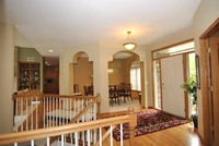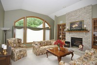The foyer is flanked by a den and formal dining room, each with arched Marvin windows and racetrack ceiling. The family room has built-in bookcases, arched windows and a two-sided fireplace shared with the kitchen.