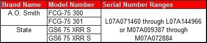This recall involves 75 gallon natural and propane gas water heaters. 'A.O. Smith' and 'State' is printed on the side of the unit. A.O. Smith and State model and serial numbers included in this recall are listed in the chart below. Model and serial numbers are printed on the water heater's rating plate.