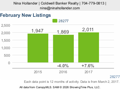 New listings increased 7.8% versus February 2016, but still hardly relieving the strain to a high demand market starved of available inventory. The Ballantyne area's months supply of homes remains at below two months at 1.9 months (down 13.6% versus February 2016).