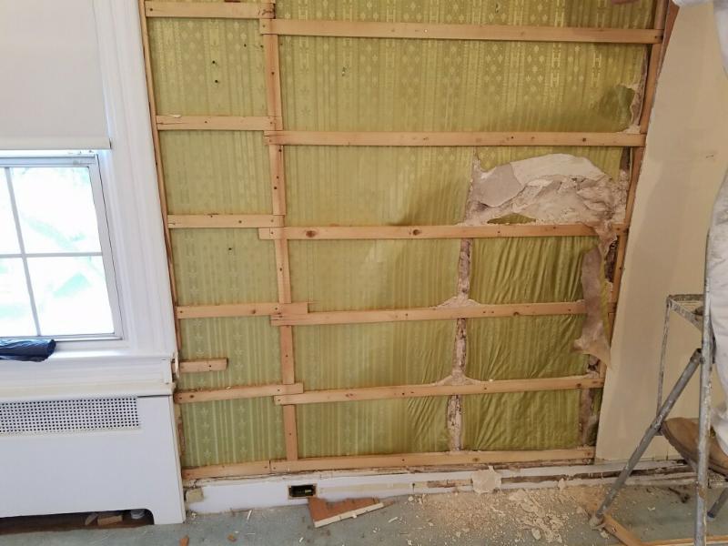 ... a fireplace that had been boarded up. Obviously, a past owner did not like the fireplace and had it plastered over, but the work wasn't done correctly and the flue enabled moisture to degrade the plaster. Years later, someone put paneling over the damaged plaster and wallpapered it.