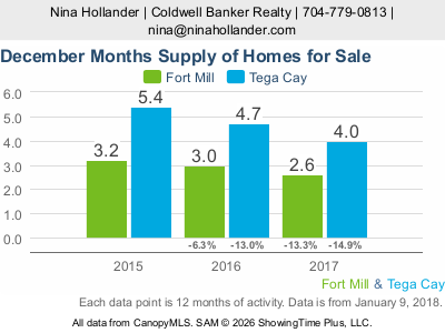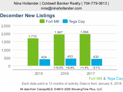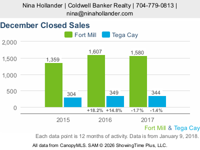 Closed sales of homes in Fort Mill during December 2017 decreased by 1.7% compared with the same period last year. In Tega Cay, closed sales decreased by 1.4% versus December 2016. Pending sales in December 2017 were also down -- down 1.0% in Fort Mill and down by 9.1% in Tega Cay versus December 2016. To some degree this can be attributed to the decrease in the months supply of homes for sale, the drop in new listings coming on the market especially in Tega Cay, and holiday seasonality.