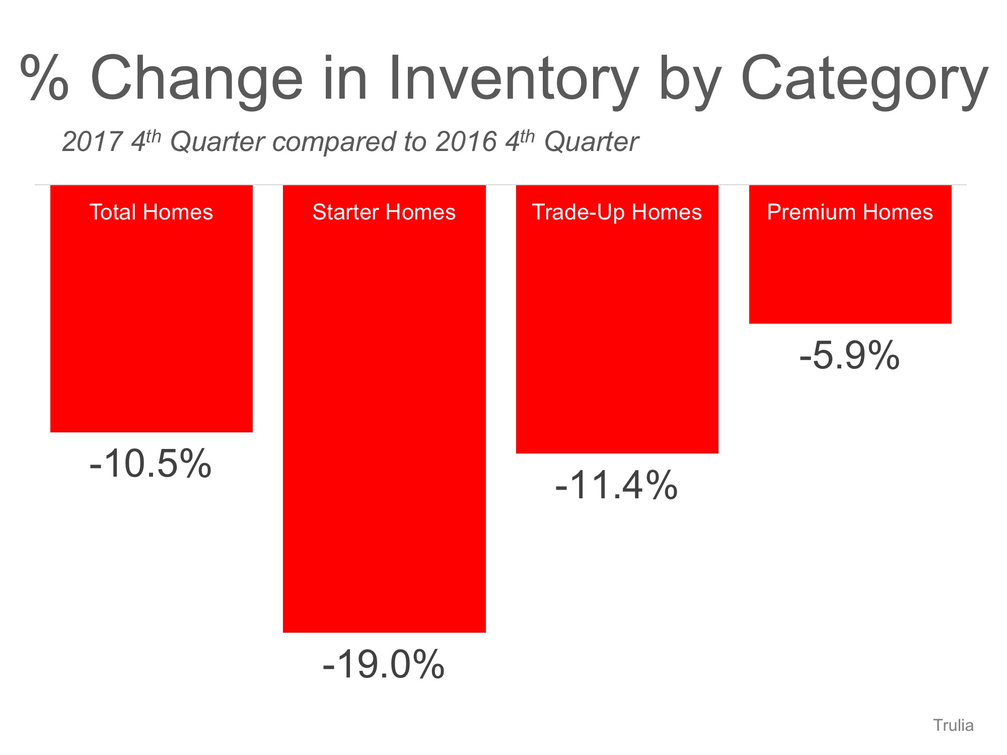 Trulia reported that “in Q4 2017, U.S. home inventory decreased by 10.5%. That is the biggest drop we’ve seen since Q2 2013.”