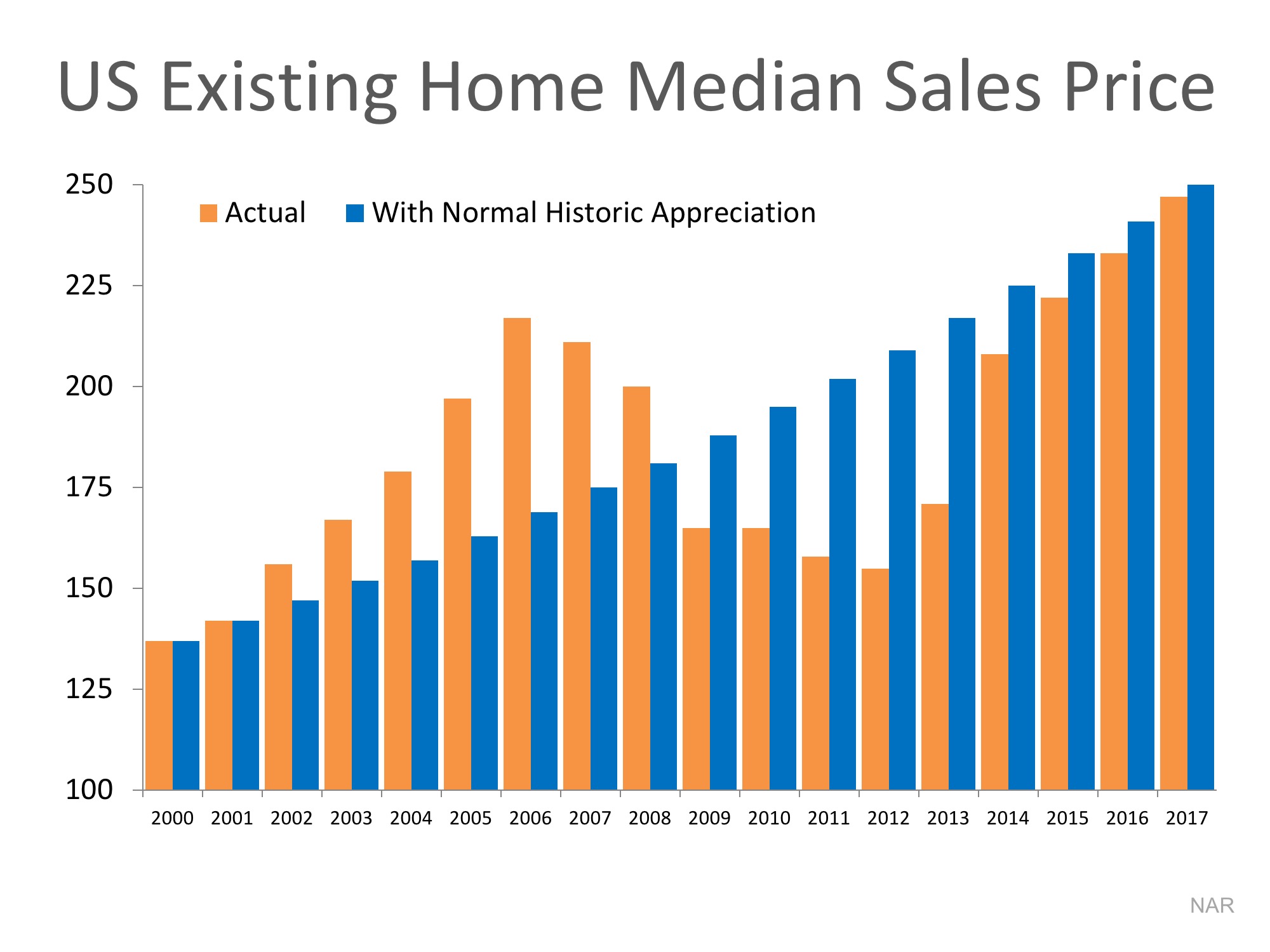 The blue bars on this graph represent where prices would be if they had increased by the normal annual appreciation rate (3.6%). By adding 3.6% to the actual 2000 price and repeating that for each subsequent year, we can see that prices were overvalued during the boom, undervalued during the bust, and a little bit LOWER than where they should be right now.