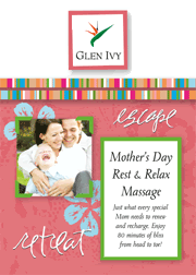Mothers, daughters, sisters and girlfriends unite! At Glen Ivy, we believe Moms deserve special treatment more than one day a year. In honor of you, we're celebrating Mother's Day all month long. Treat yourself or another special Mom to a day pass, a Grotto spa treatment and a gourmet box lunch. The Pricing thru the month of May is: Friday-Sunday $100, Monday-Thursday $75. If you take your Mom on a Saturday or Sunday you will also invited to attend *A complimentary "Making Mother's Day Memories" scrapbooking class at 11 a.m., 1 p.m. and 3 p.m. poolside in the Tiempo Room. Limited space available, reservations are required for the class, call 1-888-GLEN-IVY. Offer available only at Glen Ivy Hot Springs Spa from May 1-May 31, 2007.