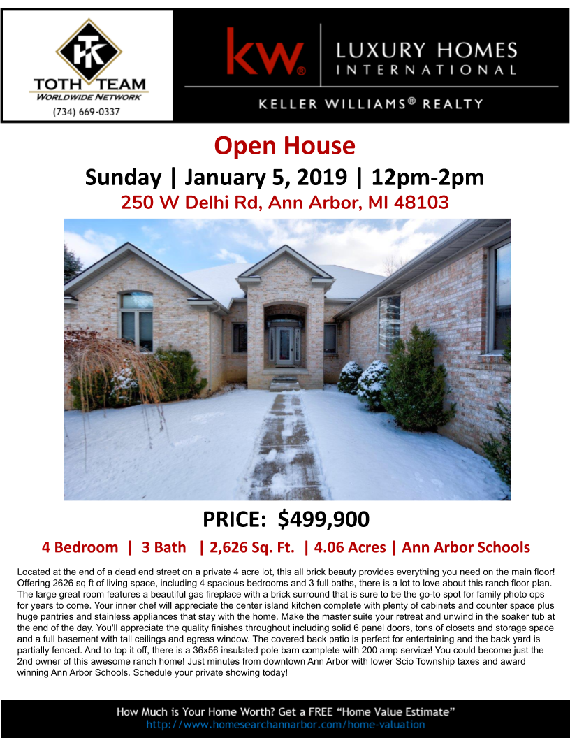 Come see Trista's Open House this Sunday!December 29th, 12PM-2PM 250 W Delhi Rd, Ann Arbor, MI 48103 Located at the end of a dead end street on a private 4 acre lot, this all brick beauty provides everything you need on the main floor! Offering 2626 sq ft of living space, including 4 spacious bedrooms and 3 full baths, there is a lot to love about this ranch floor plan. The large great room features a beautiful gas fireplace with a brick surround that is sure to be the go-to spot for family photo ops for years to come. Your inner chef will appreciate the center island kitchen complete with plenty of cabinets and counter space plus huge pantries and stainless appliances that stay with the home. Make the master suite your retreat and unwind in the soaker tub at the end of the day. You'll ...